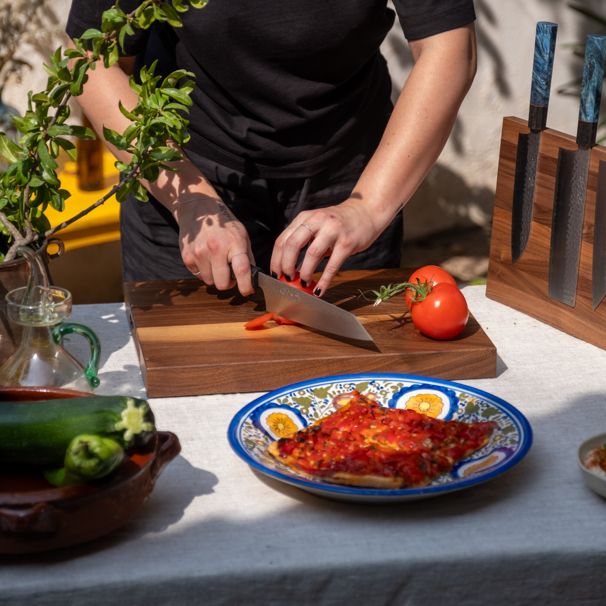 This elegant cutting board is a true culinary masterpiece, meticulously handcrafted from the finest American black walnut wood. The rich tones and beautifully varied grain patterns make each board a unique work of art. The walnut wood is prized for its exceptional density yet forgiving surface that is gentle on your sharpest Japanese knives while providing sturdy resilience for years of daily use. The artisans have purposely left out any glues, treating the solid wood board with food-safe mineral oil instead for a natural, unblemished surface.
