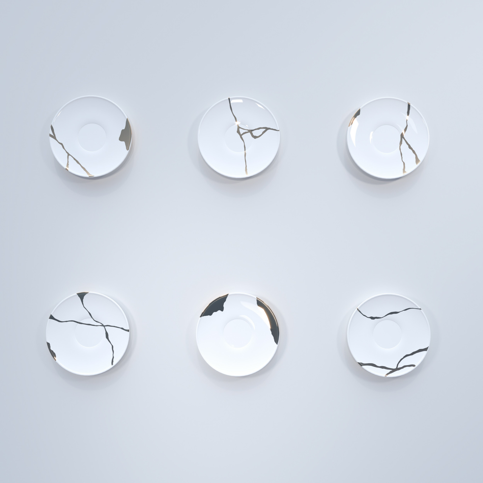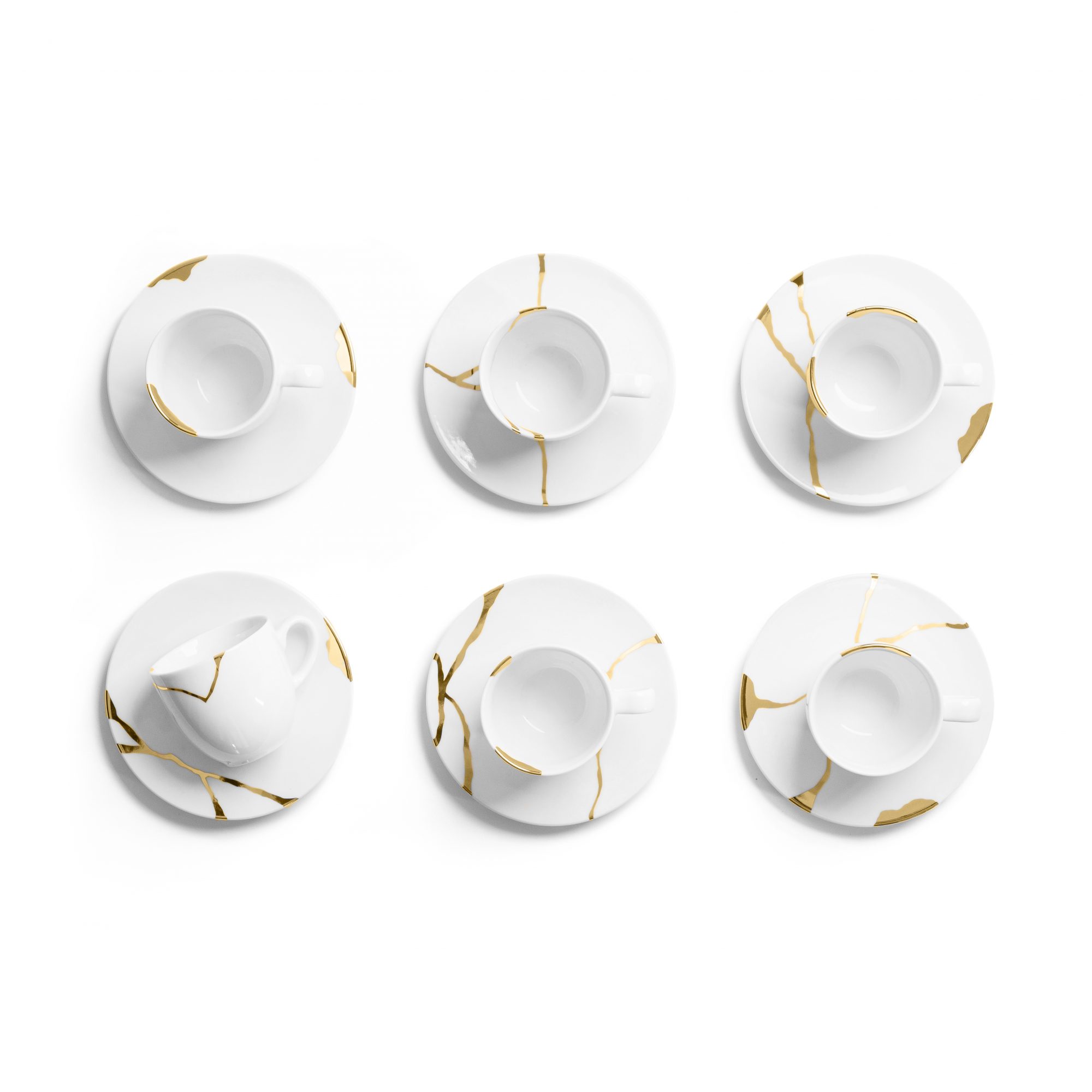 Die japanische Kunst des Kintsugi lehrt, dass zerbrochene Gegenstände, insbesondere Porzellan, nicht versteckt, sondern mit Stolz zur Schau gestellt werden sollten, und daran wollten wir alle erinnern. Wenn eine Schale, eine Teekanne oder eine kostbare Vase herunterfällt und in tausend Stücke zerbricht, werfen wir sie wütend und mit Bedauern weg. Doch es gibt eine Alternative, eine japanische Praxis, bei der die Bruchstellen hervorgehoben und aufgewertet werden, wodurch das zerbrochene Objekt an Wert gewinnt. Kintsugi (金継ぎ) oder Kintsukuroi (金繕い), wörtlich Gold (“kin”) und Reparatur (“tsugi”), ist eine traditionelle japanische Kunst, bei der ein Edelmetall – flüssiges Gold, flüssiges Silber oder mit Goldpulver bestäubter Lack – verwendet wird, um die Scherben eines zerbrochenen Töpferwarenstücks wieder zusammenzufügen und gleichzeitig die Bruchstellen aufzuwerten. Die Technik besteht darin, Porzellanfragmente zusammenzufügen und ihnen ein neues, raffinierteres Aussehen zu verleihen. Jedes reparierte Stück ist ein Unikat, da die Keramik zufällig zerbricht und unregelmäßige Muster entstehen, die durch die Verwendung von Metallen verstärkt werden. Bei der Gestaltung der Kintsugi Collection haben wir uns von dieser alten japanischen Kunst der Keramikreparatur inspirieren lassen. Durch das Reparieren zerbrochener Keramik war es möglich, der Keramik ein neues Leben zu geben, das durch ihre “Narben” noch raffinierter werden konnte.