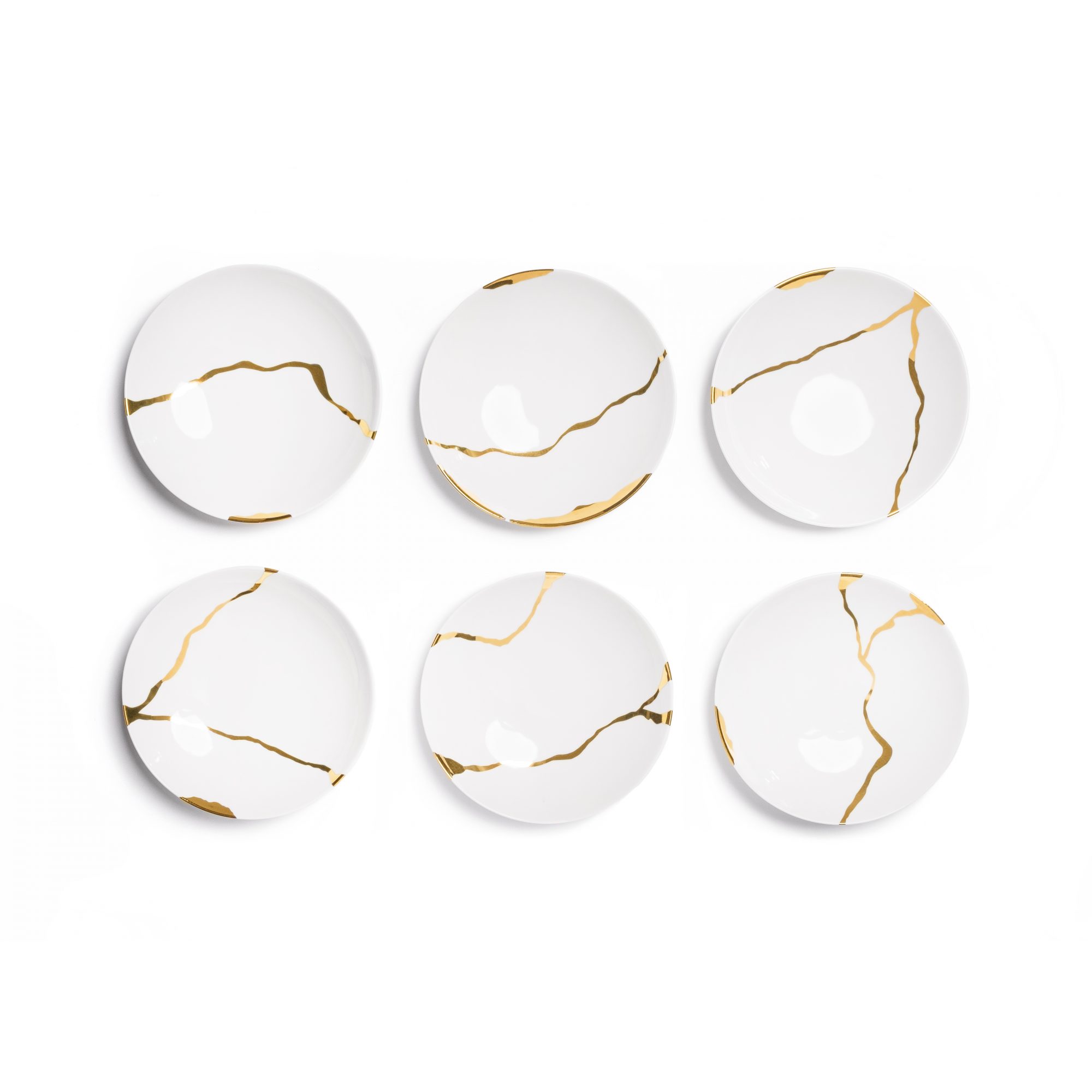 Die japanische Kunst des Kintsugi lehrt, dass zerbrochene Gegenstände, insbesondere Porzellan, nicht versteckt, sondern mit Stolz zur Schau gestellt werden sollten, und daran wollten wir alle erinnern. Wenn eine Schale, eine Teekanne oder eine kostbare Vase herunterfällt und in tausend Stücke zerbricht, werfen wir sie wütend und mit Bedauern weg. Doch es gibt eine Alternative, eine japanische Praxis, bei der die Bruchstellen hervorgehoben und aufgewertet werden, wodurch das zerbrochene Objekt an Wert gewinnt. Kintsugi (金継ぎ) oder Kintsukuroi (金繕い), wörtlich Gold (“kin”) und Reparatur (“tsugi”), ist eine traditionelle japanische Kunst, bei der ein Edelmetall – flüssiges Gold, flüssiges Silber oder mit Goldpulver bestäubter Lack – verwendet wird, um die Scherben eines zerbrochenen Töpferwarenstücks wieder zusammenzufügen und gleichzeitig die Bruchstellen aufzuwerten. Die Technik besteht darin, Porzellanfragmente zusammenzufügen und ihnen ein neues, raffinierteres Aussehen zu verleihen. Jedes reparierte Stück ist ein Unikat, da die Keramik zufällig zerbricht und unregelmäßige Muster entstehen, die durch die Verwendung von Metallen verstärkt werden. Bei der Gestaltung der Kintsugi Collection haben wir uns von dieser alten japanischen Kunst der Keramikreparatur inspirieren lassen. Durch das Reparieren zerbrochener Keramik war es möglich, der Keramik ein neues Leben zu geben, das durch ihre “Narben” noch raffinierter werden konnte.