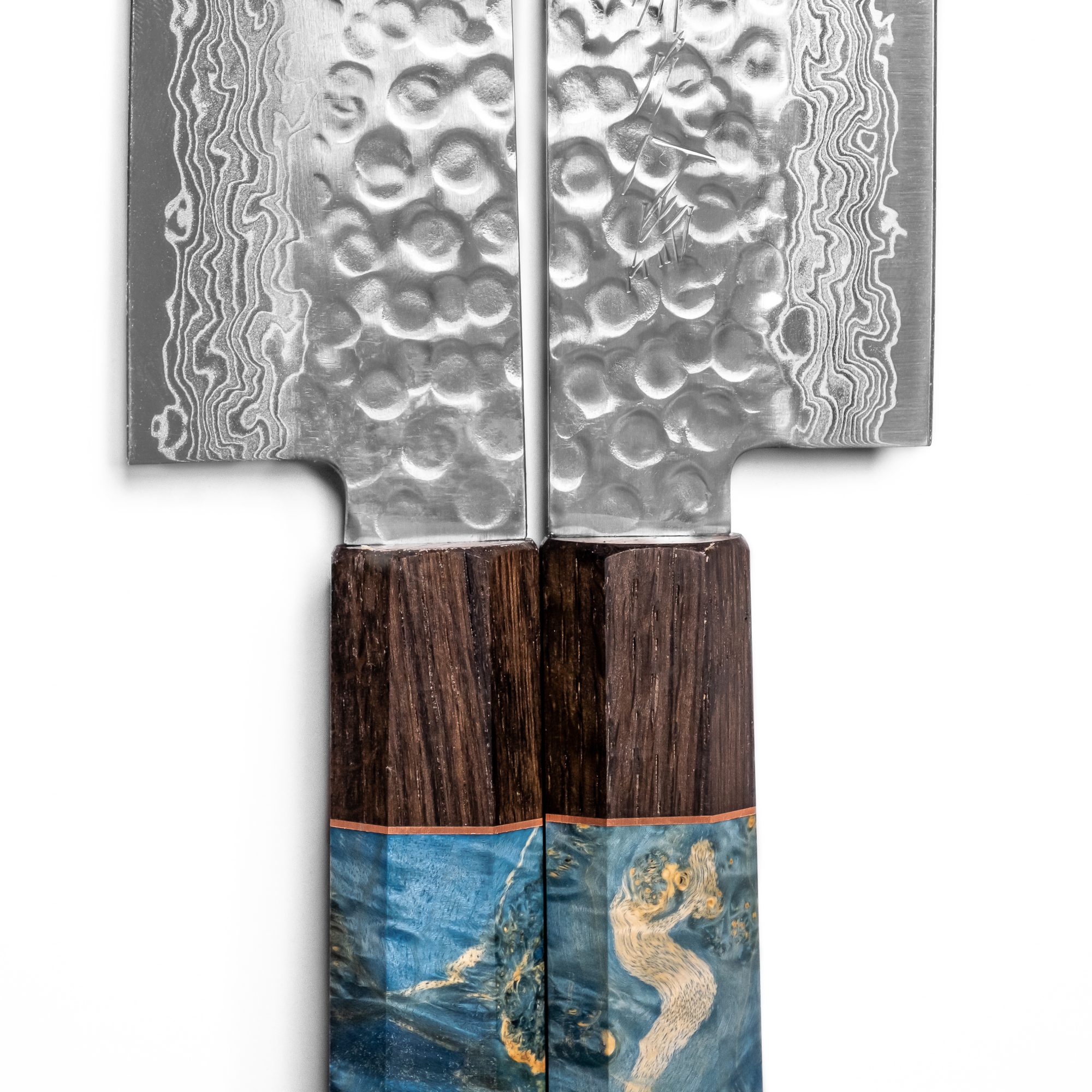 The beautiful handle is made with extremely limited European maple burl dyed in a Mediterranean Blue colour and feature a subtle copper ring under the oak bog wood kakumaki (collar of the handle). The wood has to be dried for two years before it undergoes the process of stabilisation. This ensures the wood is completely waterproof to avoid bacteria growth and is able to last generations.