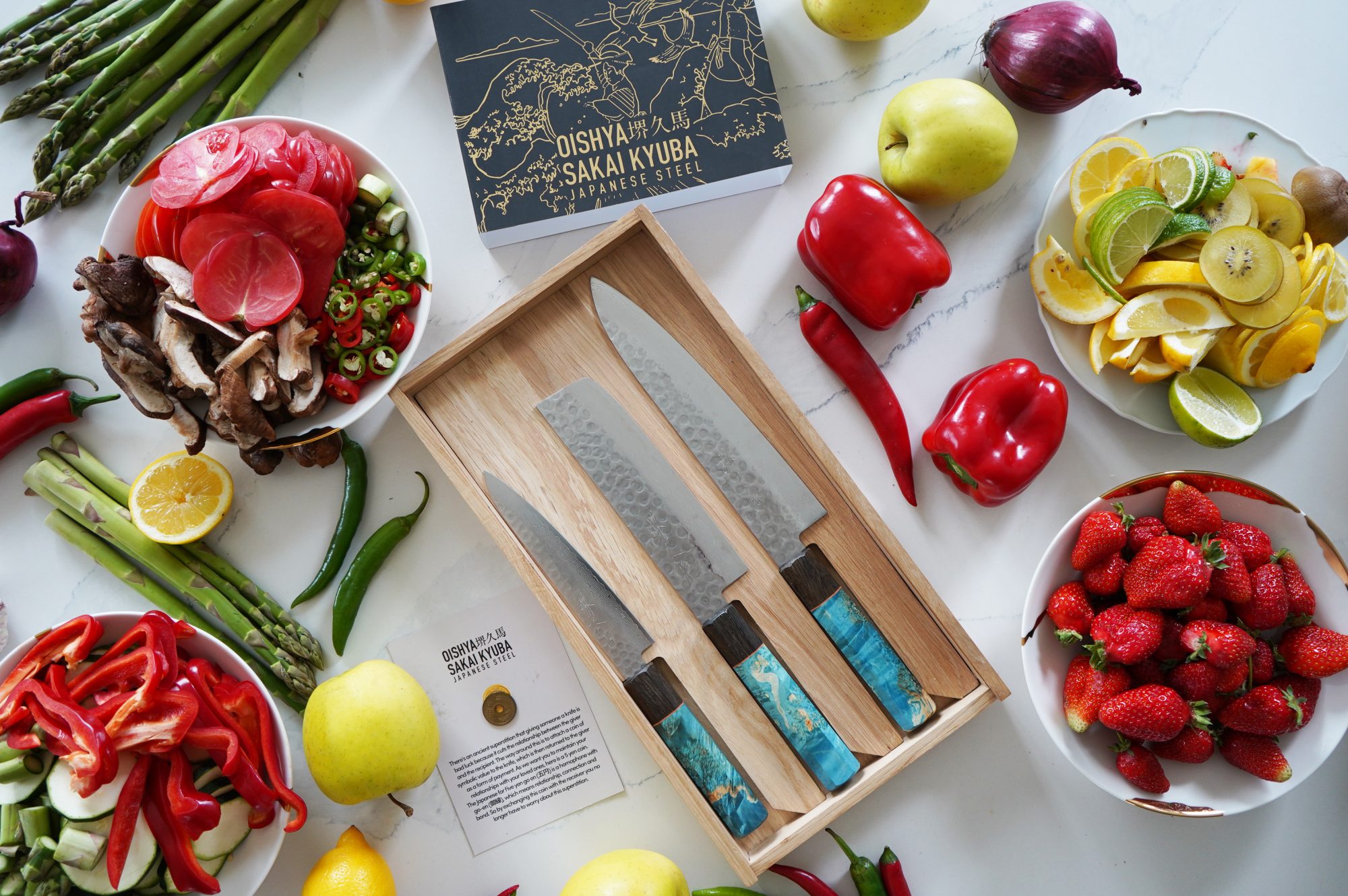 The Sakai Kyuba Japanese kitchen knife set in Olive Green includes three knives, each perfectly balanced with optimal sharpness, precision and durability: