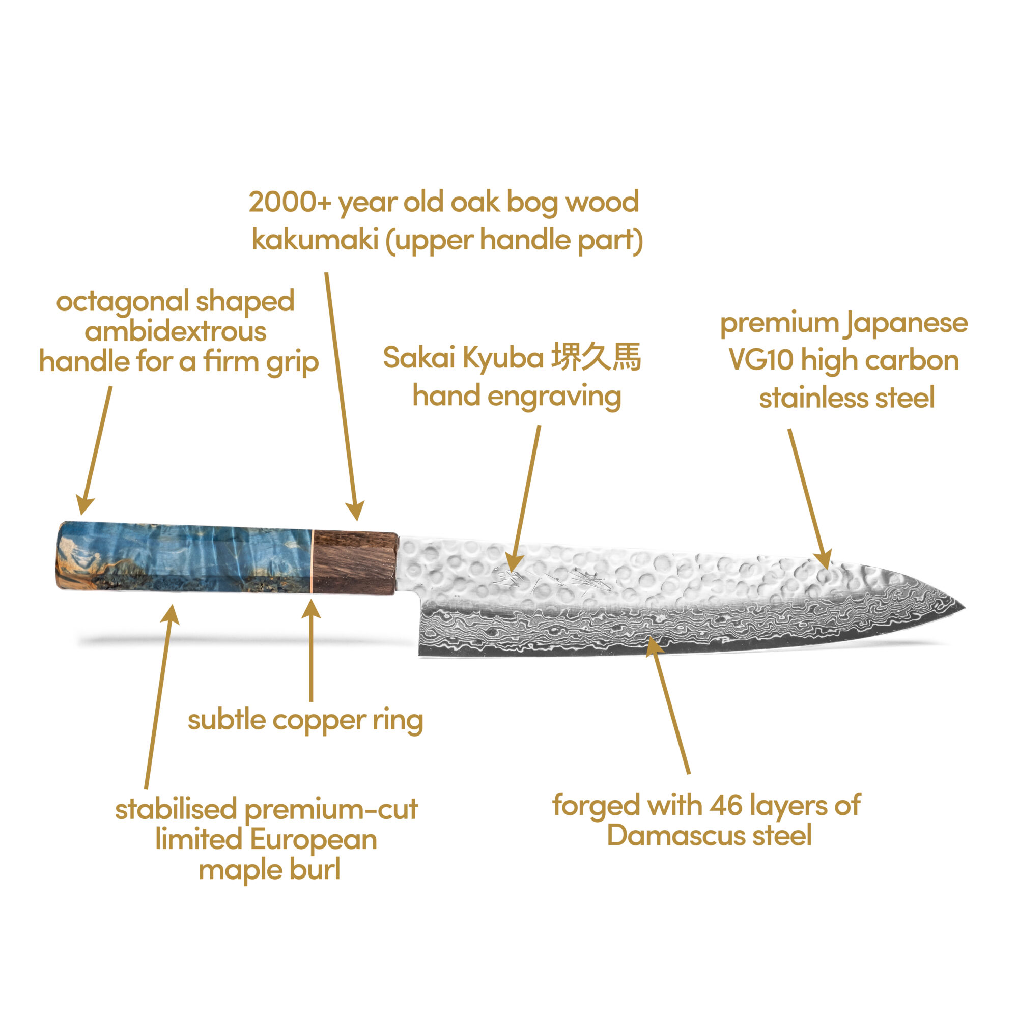The beautiful handles are made with extremely limited European maple burl dyed in an Mediterranean Blue colour and feature a subtle copper ring under the oak bog wood kakumaki (collar of the handle). The wood has to be dried for two years before it undergoes the process of stabilisation. This ensures the wood is completely waterproof to avoid bacteria growth and is able to last generations.