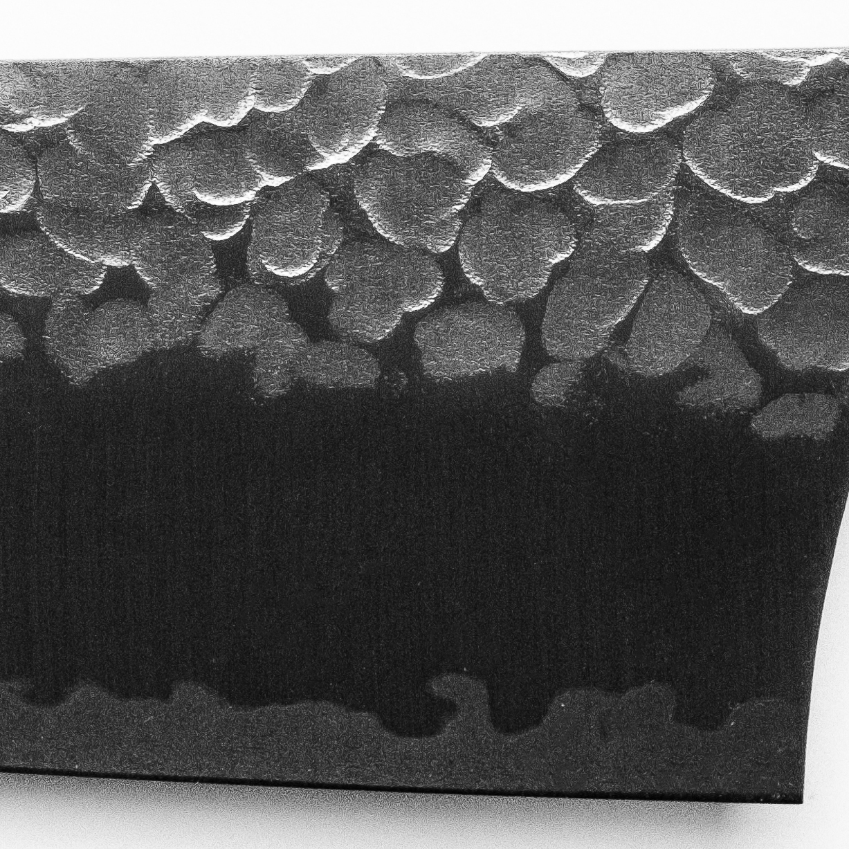Crafted with a VG10 steel core and a 3-layer construction, the Seki Kyuba KATA Santoku embodies the pinnacle of Japanese metallurgy. The VG10 core provides exceptional edge retention and ease of sharpening, whilst the outer layers contribute to overall durability and stain resistance. The blade’s hammered finish adds a touch of artisanal beauty and helps to reduce food adhesion during cutting, making your prep work smoother and more efficient.