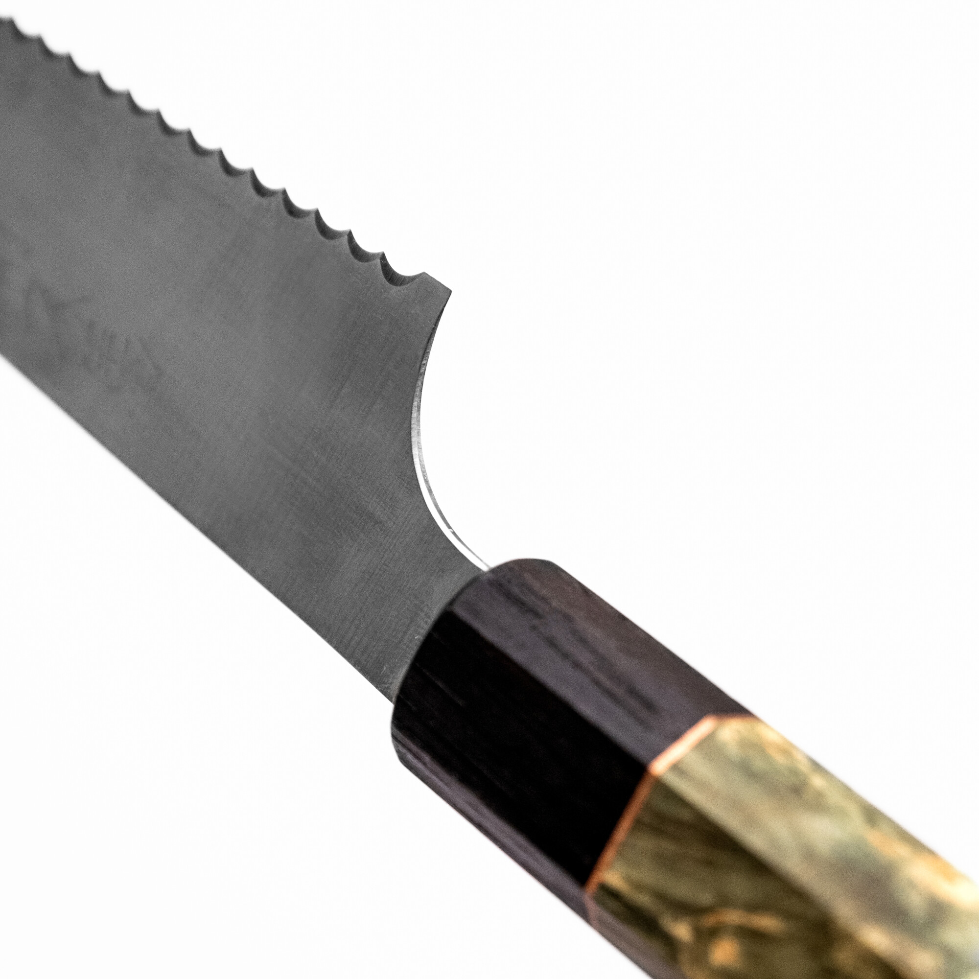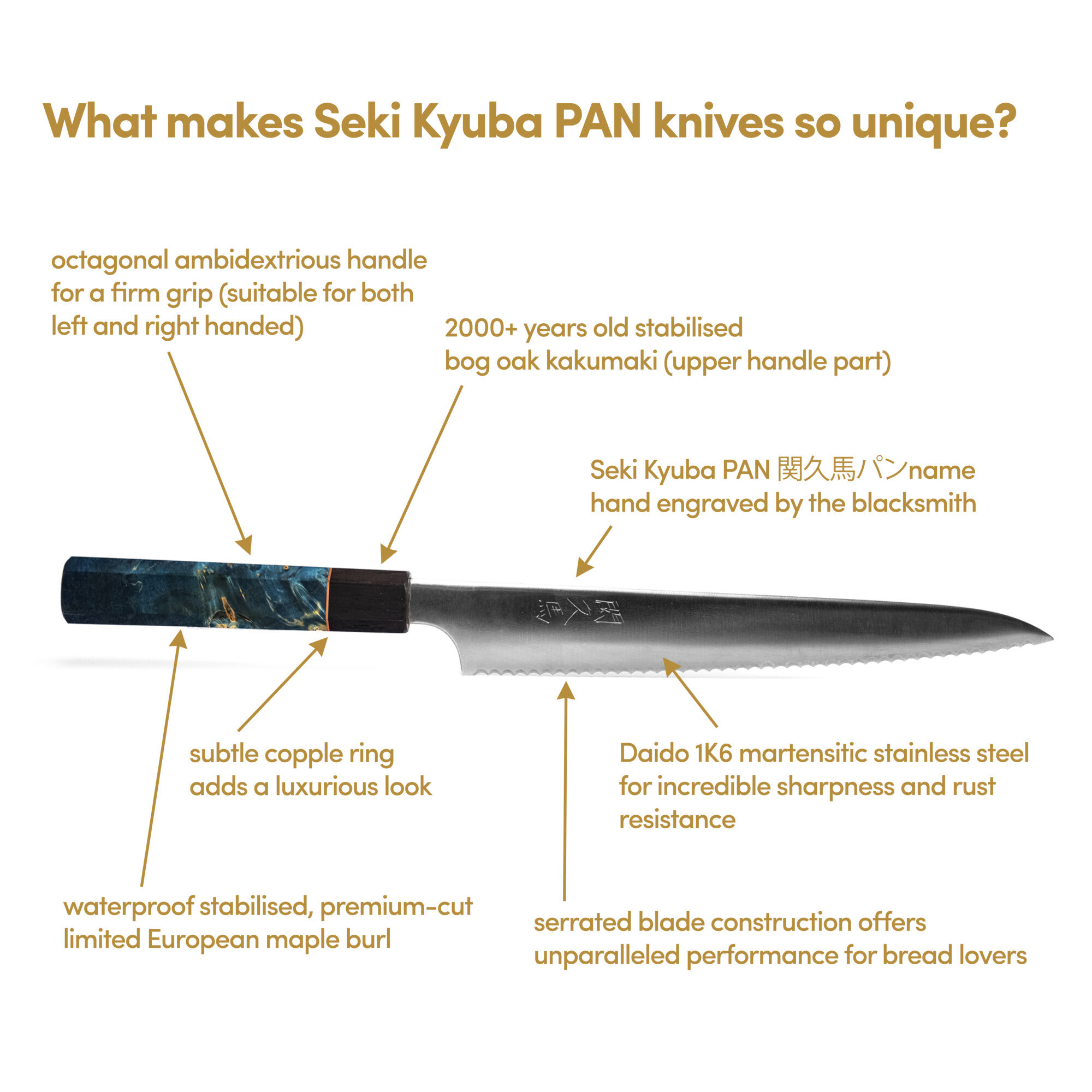 Dieses japanische Seki Kyuba Pan-Brotmesser ist bequem, leicht und schnell. Dank seines doppelten Schliffs ist es sowohl für Links- als auch für Rechtshänder geeignet. Ein Messer, das so einzigartig und unvergänglich ist wie die Erinnerungen, die Sie mit ihm schaffen werden.