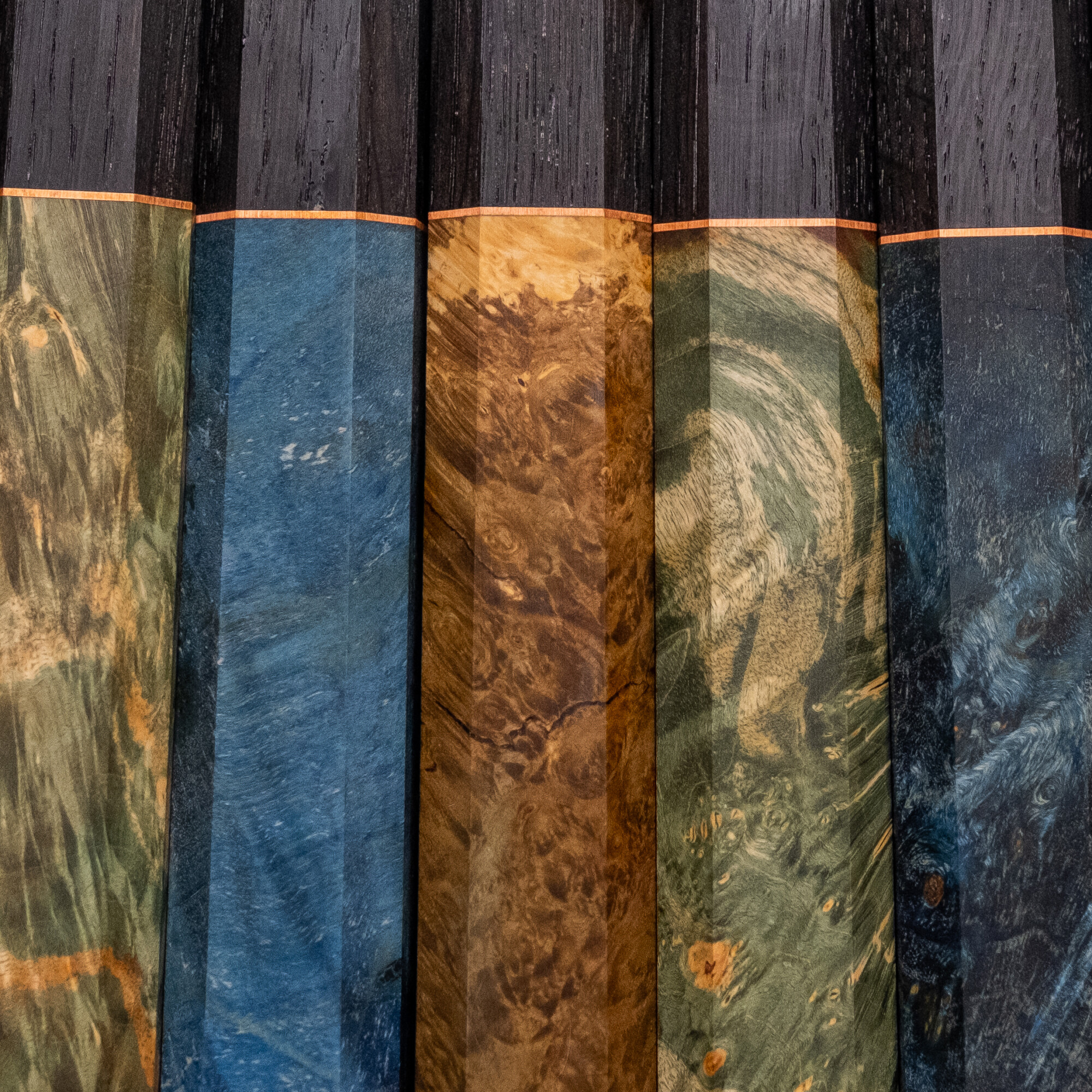 Keine zwei Grifffarben oder -muster sind jemals gleich, da die natürlichen Eigenschaften jedes Holzblocks einzigartig sind und den Farbstoff unterschiedlich aufnehmen. Dadurch erhält jedes Messer ein wunderschönes, einzigartiges Aussehen und kann als unvergessliches Geschenk dienen.