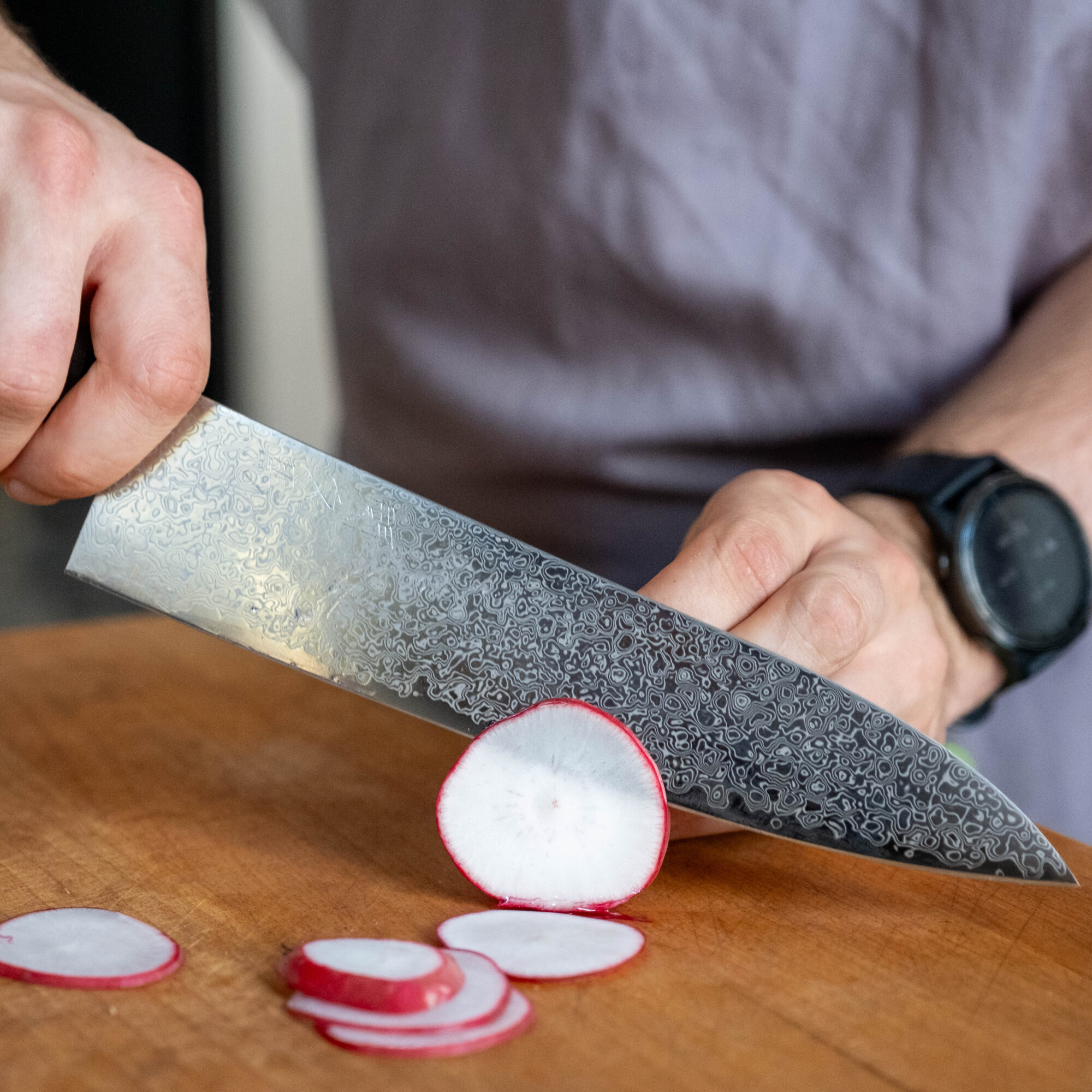 Mit einem Kern aus SG2/R2-Pulverstahl und einer 31-Lagen-Damaszener-Konstruktion verkörpert das SHIN Petty wie seine größeren Geschwister in der SHIN-Linie das absolut Beste der japanischen Metallurgie. Der SG2/R2-Kern sorgt für unvergleichliche Schnitthaltigkeit und Schärfe, während die 31 Lagen zur allgemeinen Haltbarkeit und Fleckenbeständigkeit beitragen und ein atemberaubendes Damastmuster erzeugen. Das gehämmerte Finish der Klinge, das sich über den Damast legt, sorgt nicht nur für ein atemberaubendes optisches Element, sondern trägt auch dazu bei, das Anhaften von Lebensmitteln während des Gebrauchs zu reduzieren und die Effizienz bei Ihren präzisen Schneideaufgaben zu erhöhen.