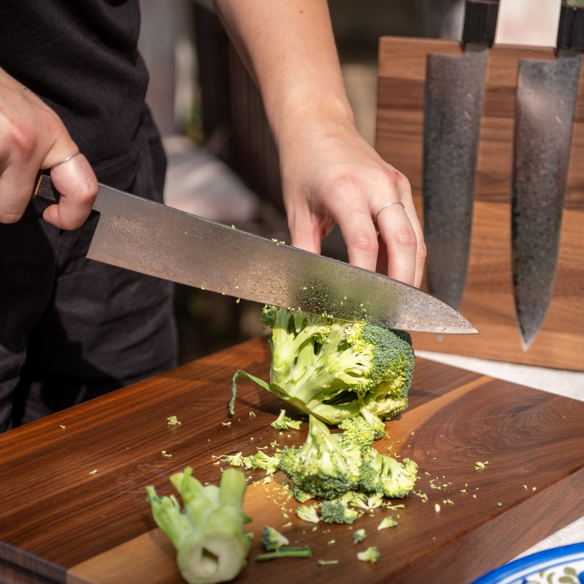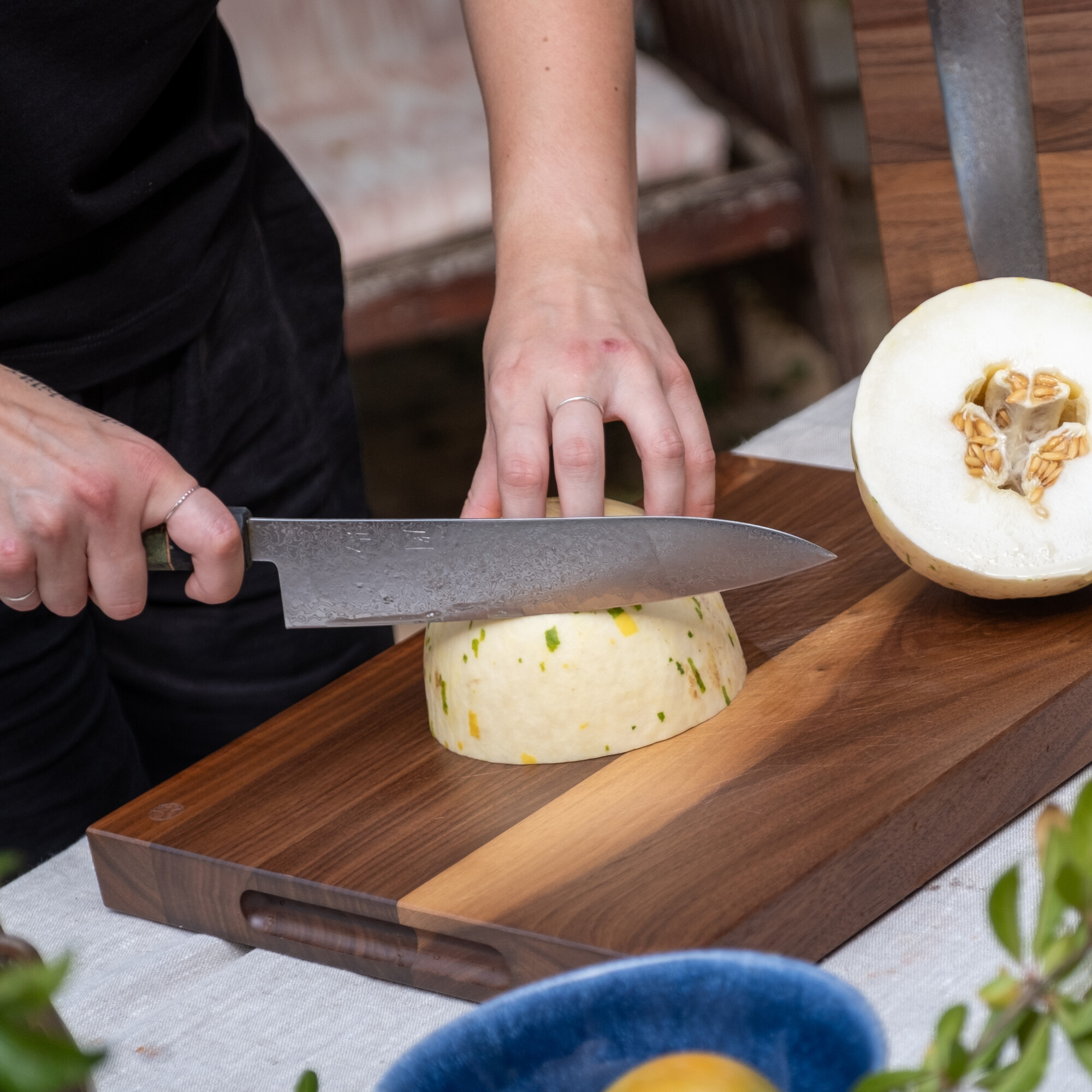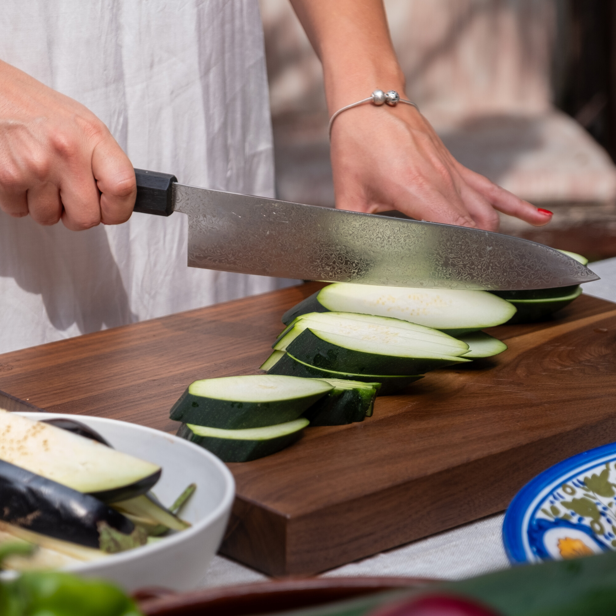 Das vielseitige Profil des Gyuto mit einer sanften Kurve entlang der Schneide ermöglicht sowohl Wipp- als auch Schiebeschnitte. Dank dieser Anpassungsfähigkeit eignet er sich für eine breite Palette von Zutaten und Schneidetechniken. Die 21-cm-Version bietet ein ausgewogenes Verhältnis von Größe und Wendigkeit, während die 24-cm-Version mehr Länge für größere Zutaten oder die Zubereitung von Stapeln bietet.