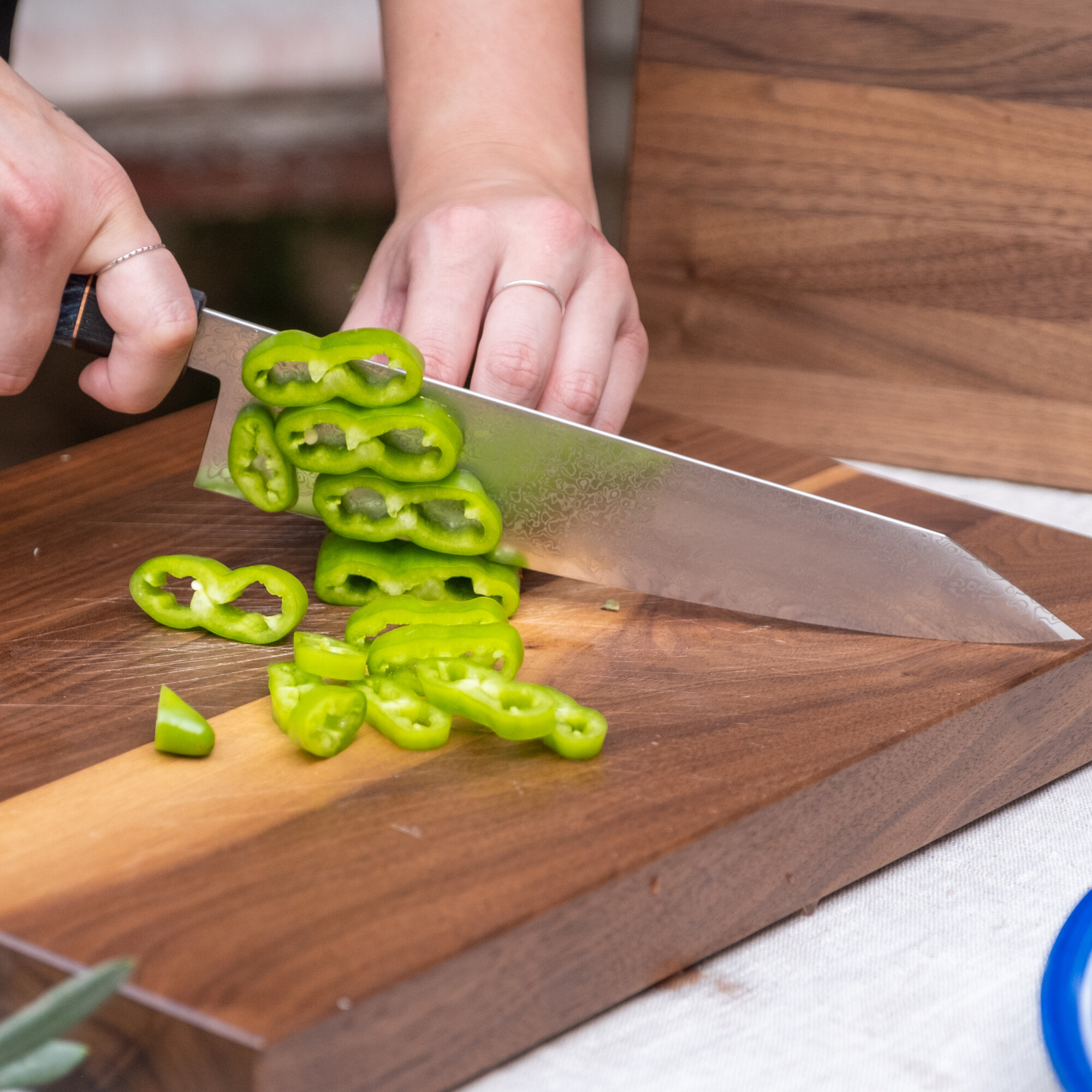 Dank seines flachen Profils und der abgewinkelten Spitze eignet sich das Kiritsuke hervorragend zum Schneiden mit dem Messer und zum präzisen Arbeiten mit der Spitze. Es eignet sich hervorragend zum Schneiden von Eiweiß, zum Hacken von Gemüse und für feine Schnitte. Die 21-cm-Version bietet mehr Beweglichkeit, während die 24-cm-Version mehr Reichweite und Schnittfläche für größere Zutaten bietet.