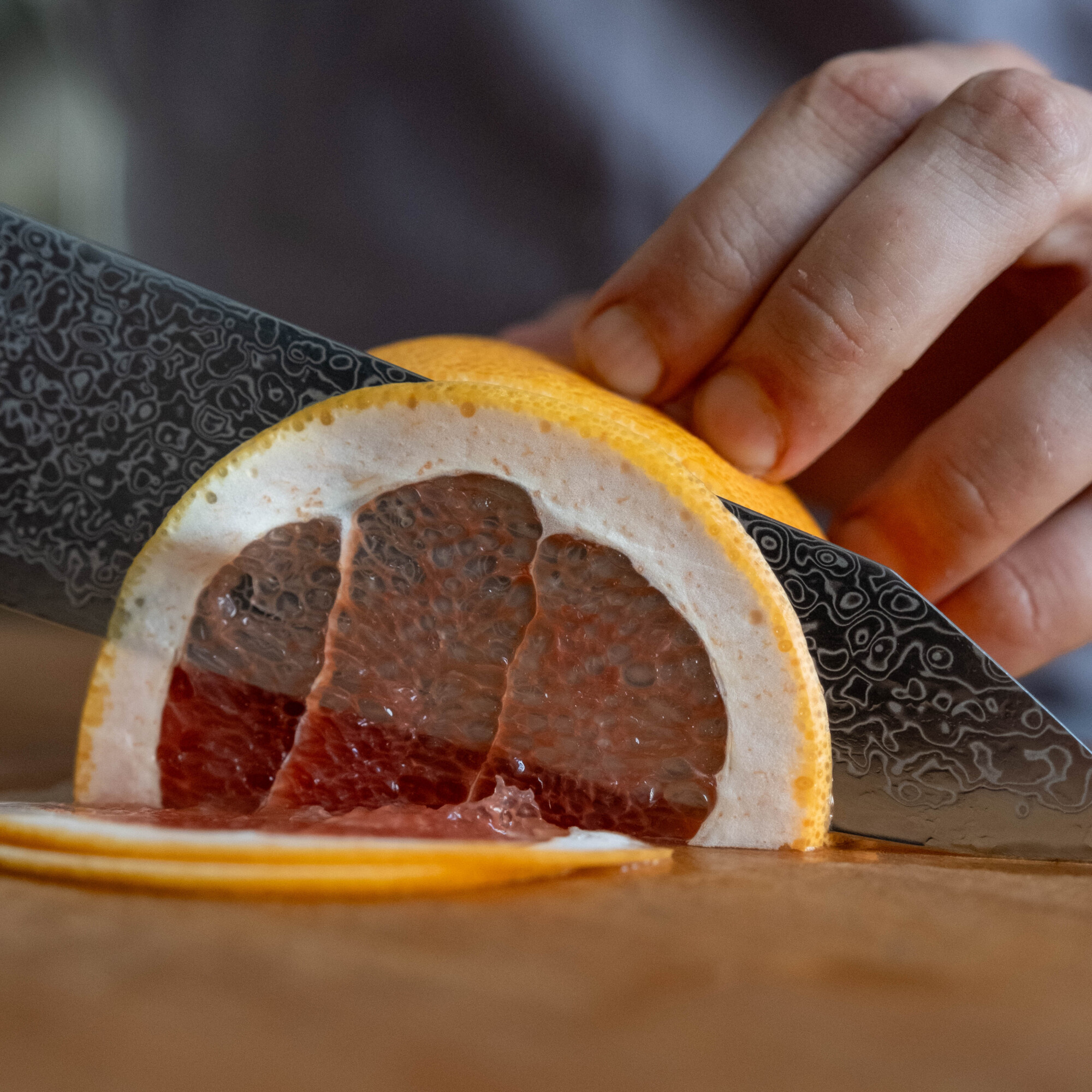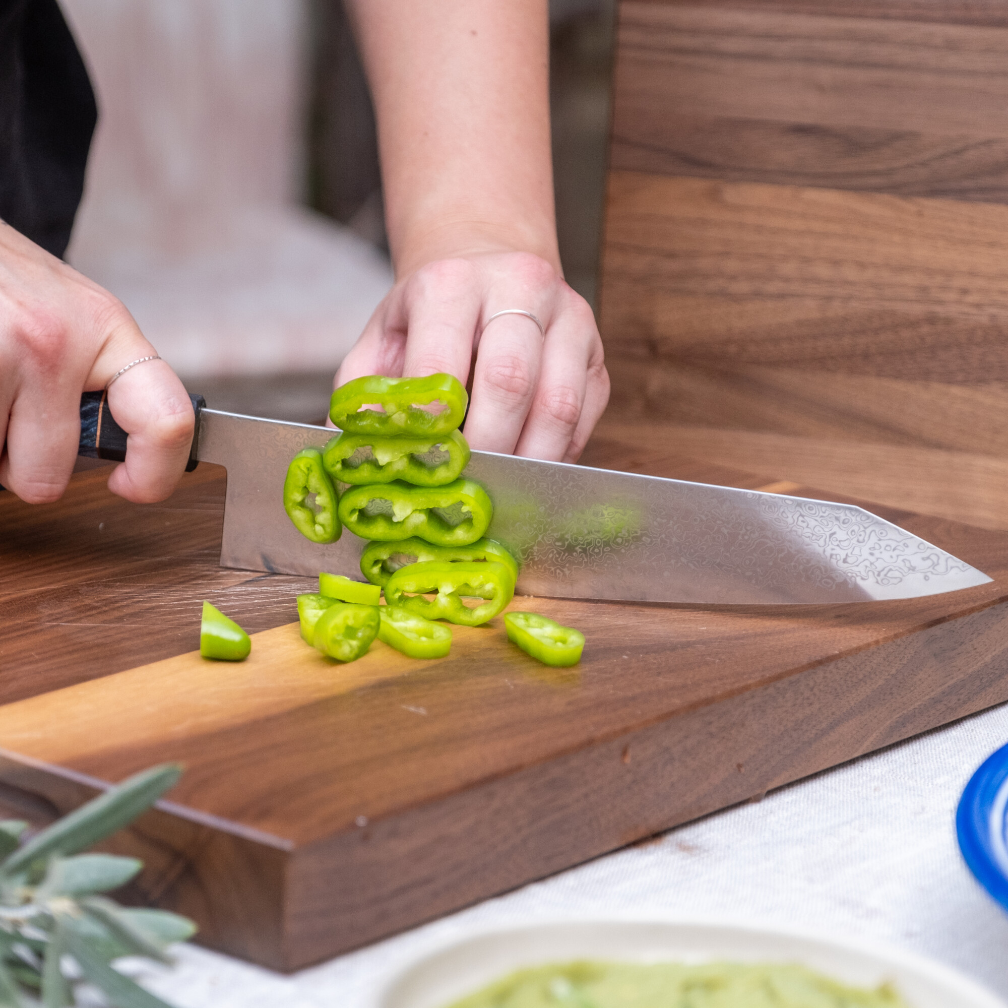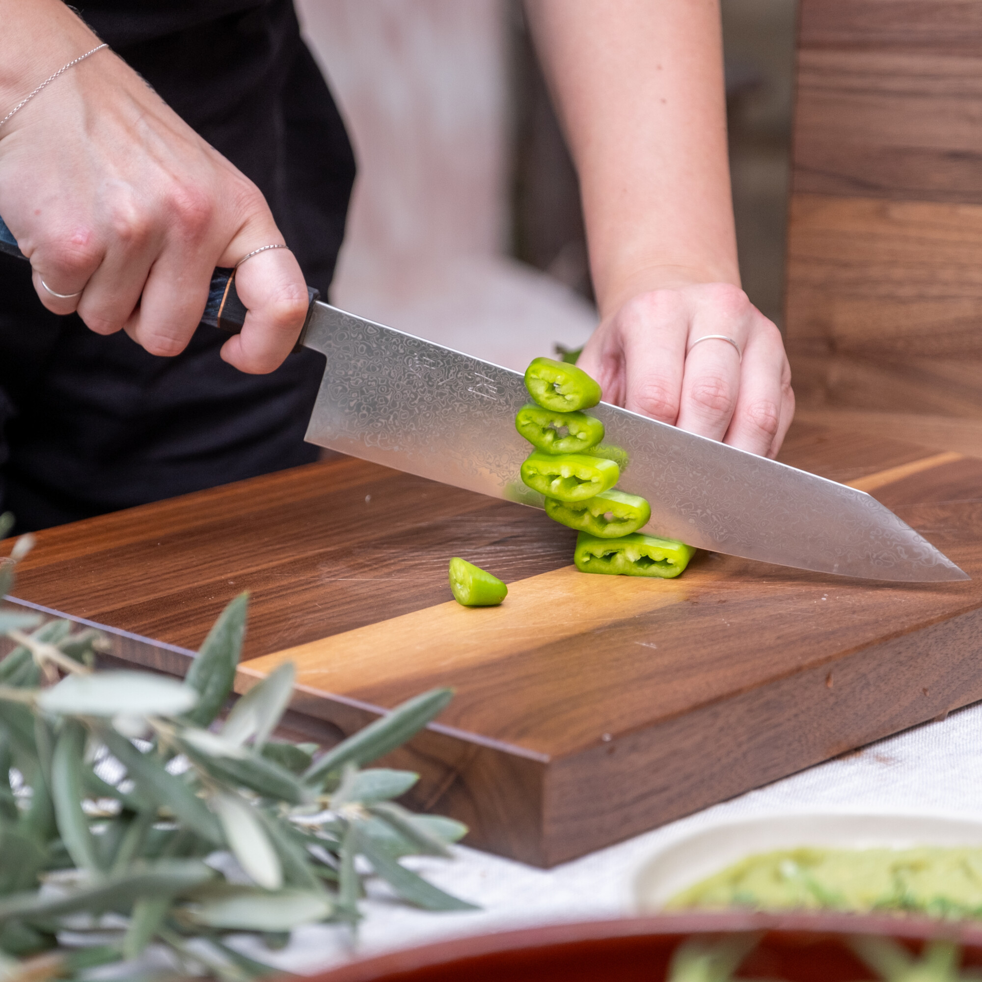 Das flache Profil und die abgewinkelte Spitze des Kiritsuke eignen sich hervorragend zum Schneiden mit Druck und für präzise Arbeiten mit der Spitze. Es eignet sich hervorragend zum Schneiden von Proteinen, zum Hacken von Gemüse und für detaillierte Schnitte. Die 21-cm-Version bietet mehr Beweglichkeit, während die 24-cm-Version zusätzliche Reichweite und Schnittfläche für größere Zutaten bietet.