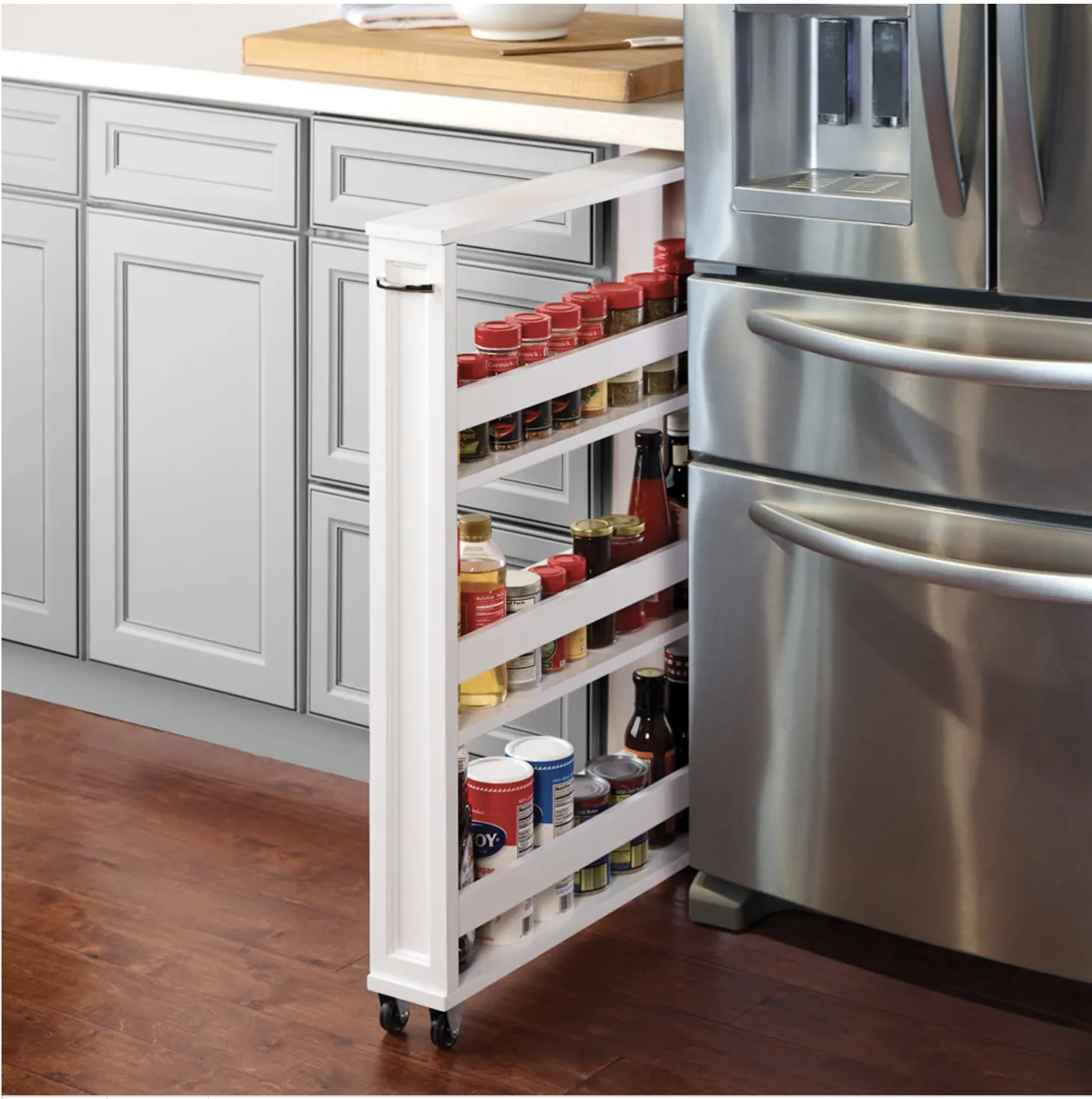 Have a gap between your fridge and the wall? This is a prime space for a small pull out cabinet. We suggest you store your canned goods or spices here!