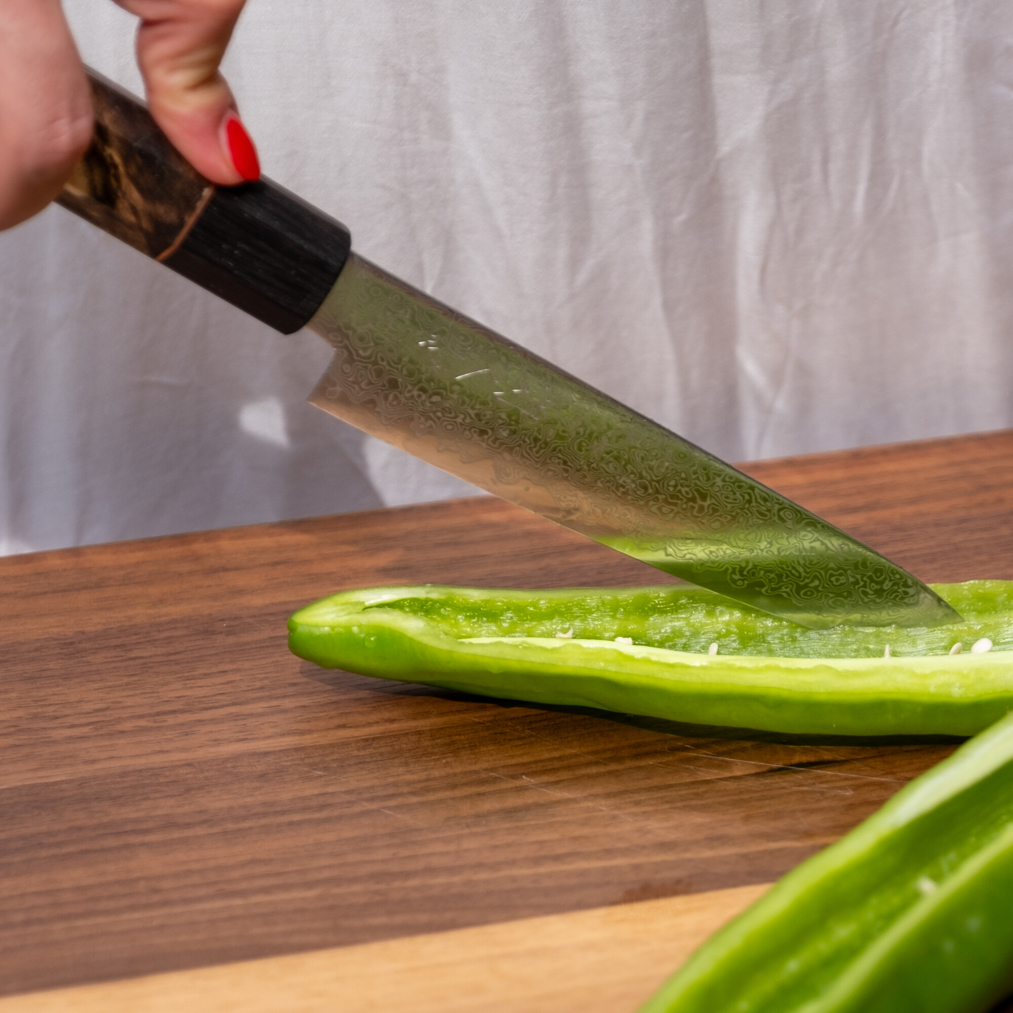 The SHIN Petty offers an impressive Rockwell Hardness rating (HRC) of 63-64, which means the edge stays noticeably sharper for a longer time, even with frequent use. This translates to less frequent sharpening and consistent, precise cuts every time you use it. Whether you’re a professional chef requiring ultimate precision for garnishes, or a discerning home cook looking for a versatile small knife that doesn’t compromise on quality, the Seki Kyuba SHIN Petty offers the perfect blend of size, sharpness, and manoeuvrability to elevate your culinary craftsmanship.