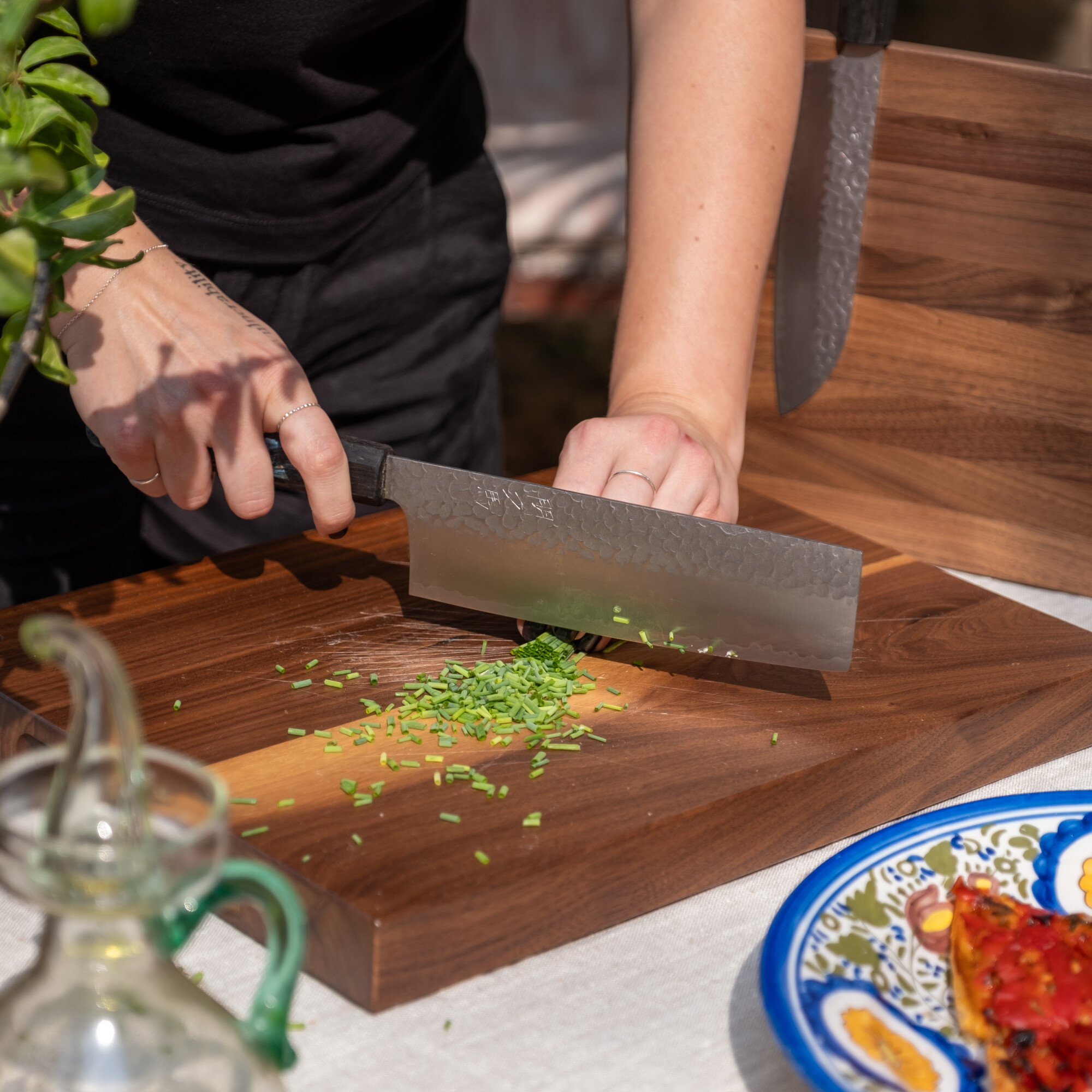 Each of these traditional Japanese knife styles has its own character and strengths. The Santoku, meaning ‘three virtues’, excels at slicing, dicing, and mincing. It features a shorter blade than a chef’s knife, with a wide, flat profile that’s particularly good for swift, precise chopping. Without much curve to its blade, it encourages clean, straight cuts rather than rocking motions.