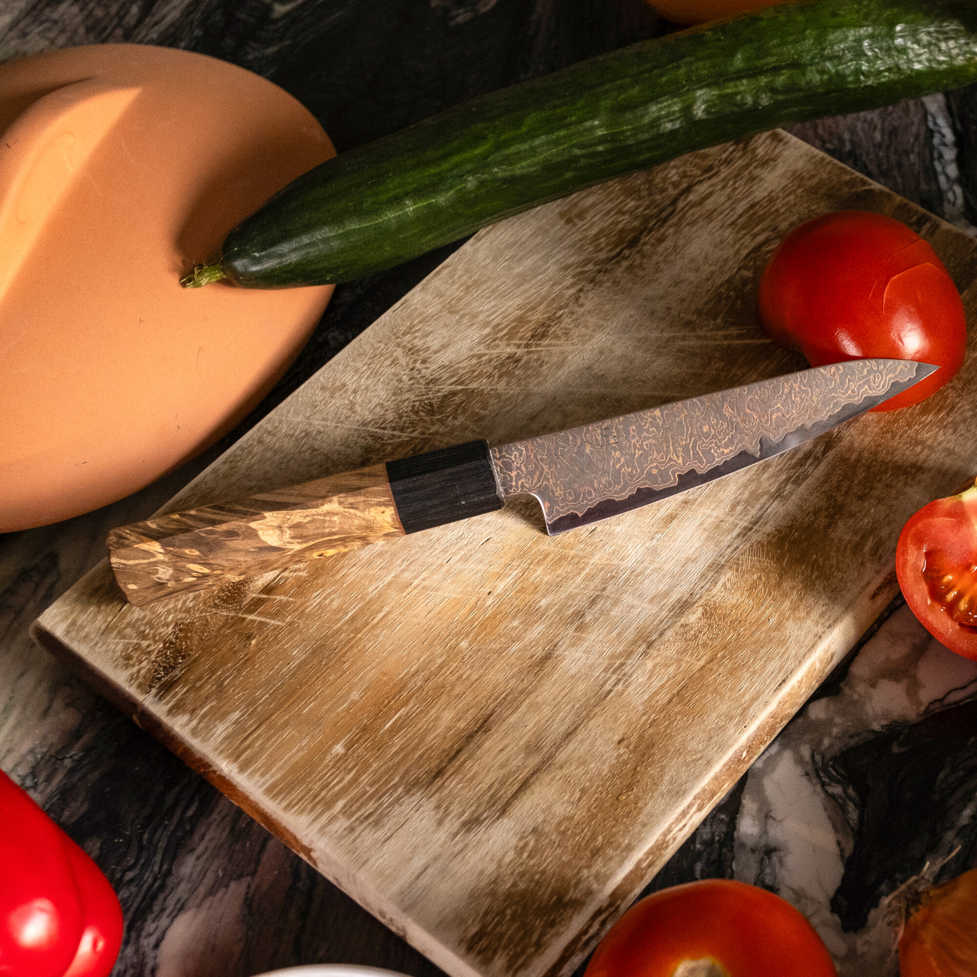 The NIJI Petty combines functionality with unmatched aesthetic appeal. Each knife features a handle crafted from durable, stabilised wood, ensuring a secure grip even during the most delicate operations. For those who view cooking as both a culinary and visual art form, the NIJI Petty transforms even the simplest kitchen tasks into an experience of beauty and precision.