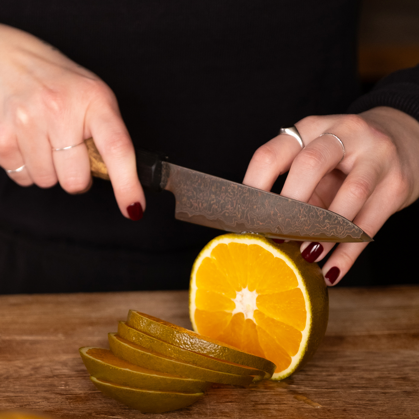 With a Rockwell Hardness of 62-63 HRC, this Petty provides excellent edge retention whilst maintaining good chip resistance. The 15cm blade length makes it ideal for intricate tasks where larger knives feel unwieldy. It excels at peeling, trimming, and detailed cutting work, making it an indispensable tool for garnish preparation, delicate fruit work, or precise meat trimming.