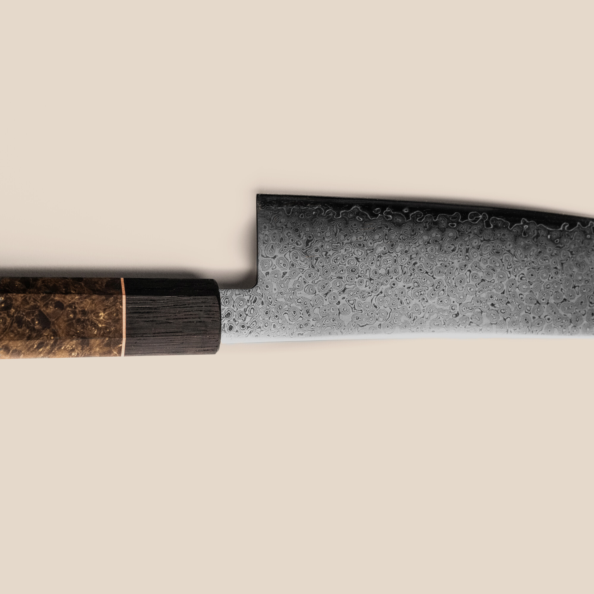 The beautiful handle is made with extremely limited European maple burl dyed in an Natural Brown colour and feature a subtle copper ring under the oak bog wood kakumaki (collar of the handle). The wood has to be dried for two years before it undergoes the process of stabilisation. This ensures the wood is completely waterproof to avoid bacteria growth and is able to last generations.