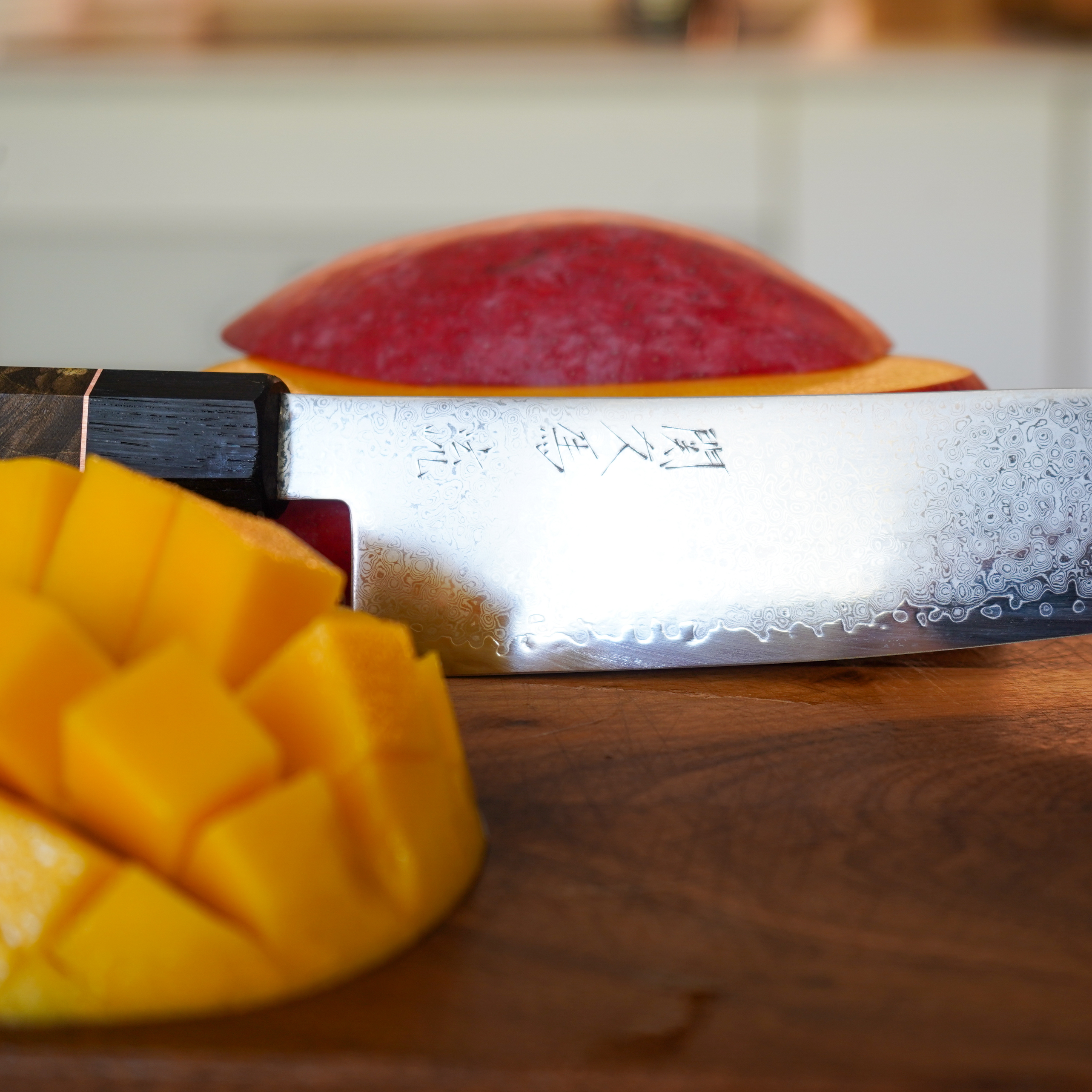 The blade’s full Damascus pattern is enhanced with a subtle hammered finish, which catches the light beautifully while creating tiny air pockets to further minimise sticking. This combination of visual artistry and functional design makes every RYU knife a statement piece in the kitchen.