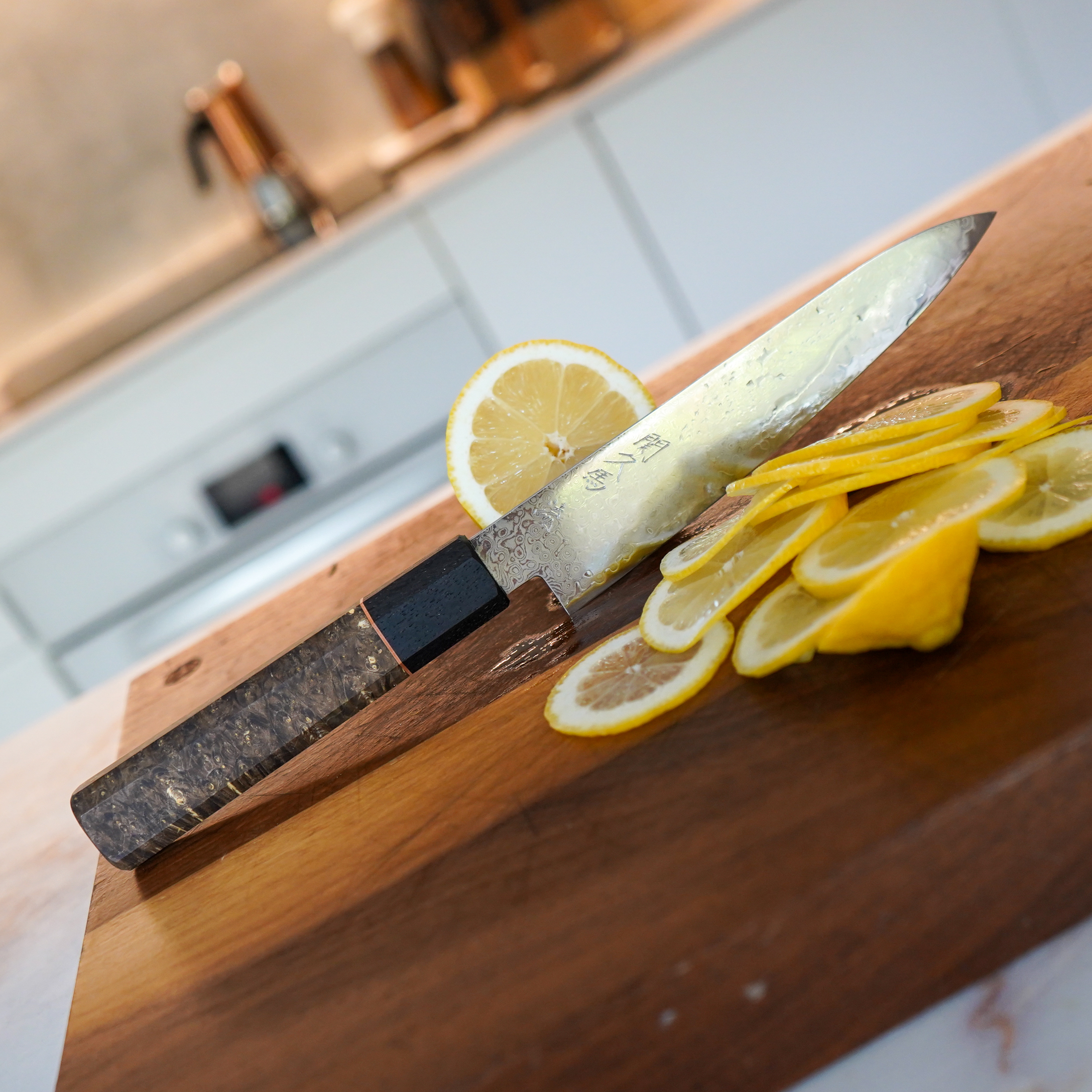 The beautiful handle is made with extremely limited European maple burl dyed in an Natural Brown colour and feature a subtle copper ring under the oak bog wood kakumaki (collar of the handle). The wood has to be dried for two years before it undergoes the process of stabilisation. This ensures the wood is completely waterproof to avoid bacteria growth and is able to last generations.