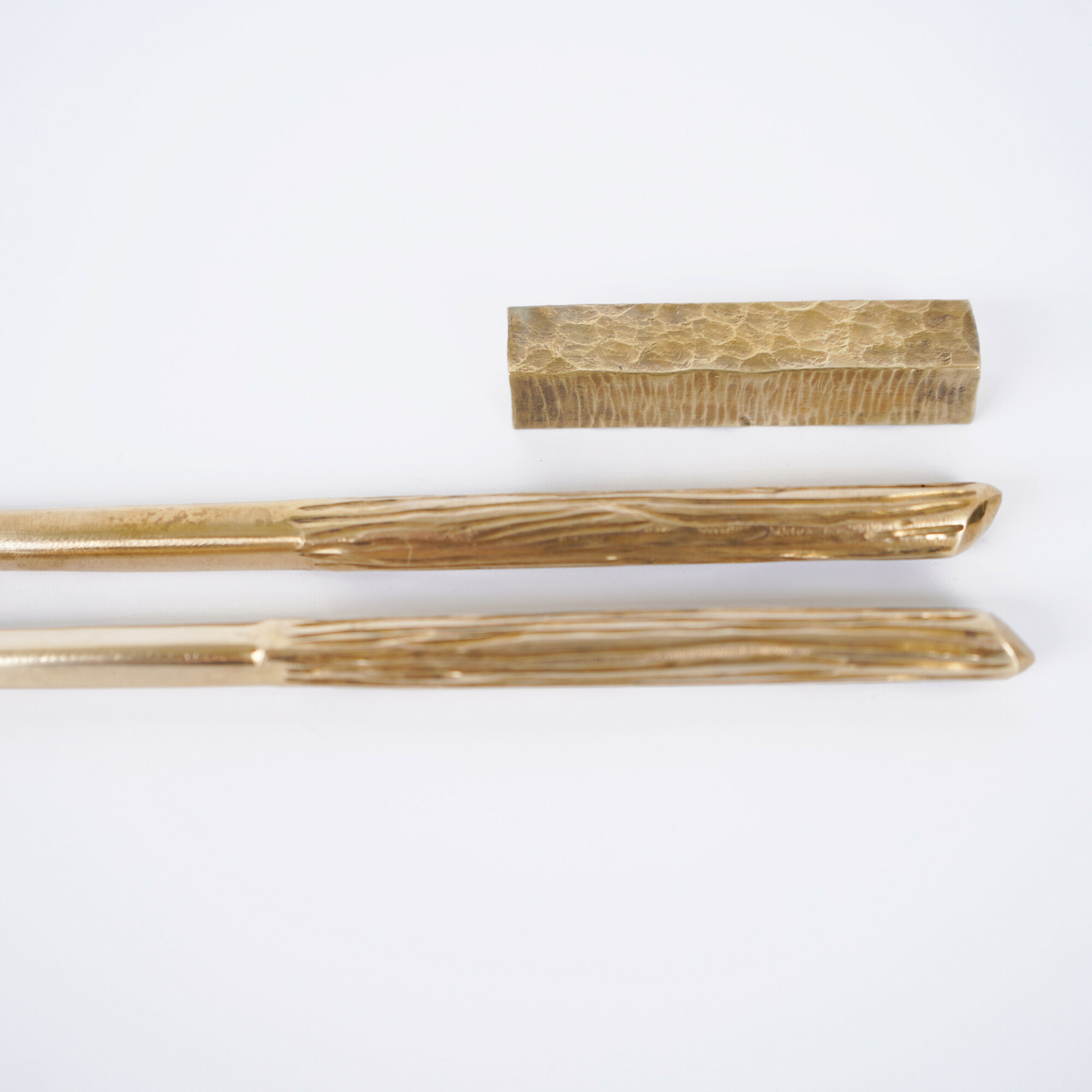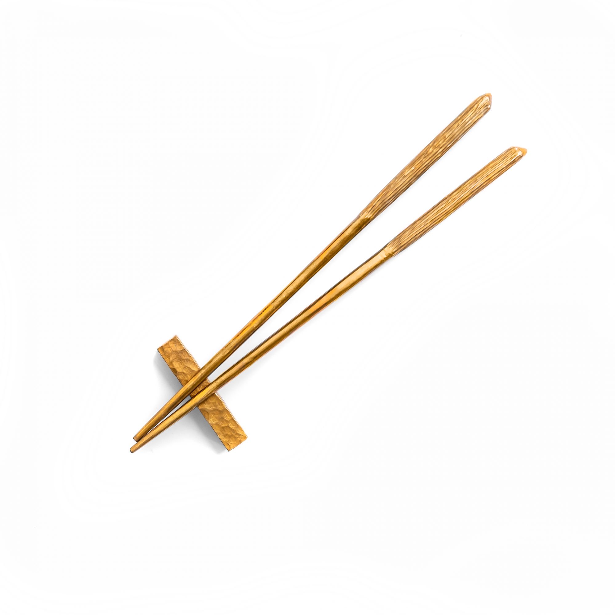 The set features a matching brass rest to place your chopsticks. It comes packed in a handcrafted, minimalist European Oak wooden box with a delicate waxed finish, wrapped in an eco-friendly satin bag. Ideal as a gift.